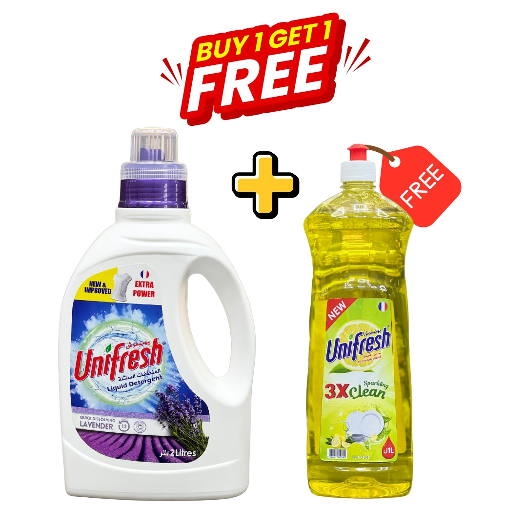 Simplify your cleaning routine with this value-packed combo from Unifresh! When you purchase the Unifresh Liquid Detergent Lavender 2L, you’ll get a FREE 1L bottle of Unifresh Dishwashing Liquid Lemon—a complete home care solution designed to deliver powerful cleaning, fresh fragrances, and incredible value.